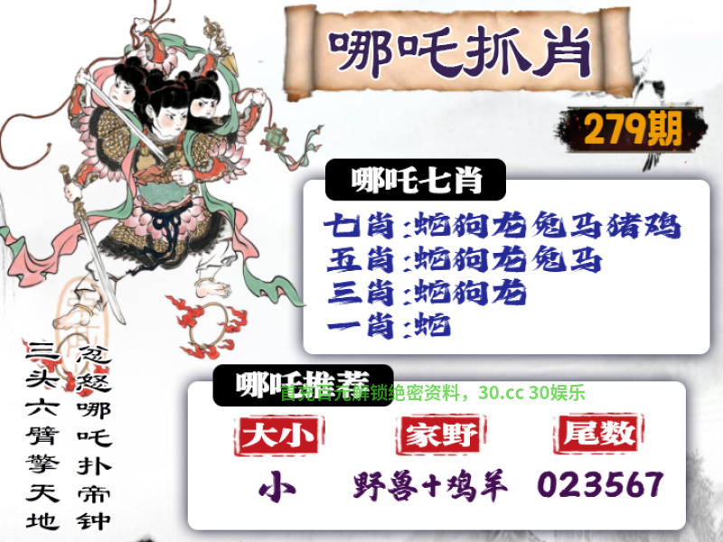 279期: ①七肖中特:蛇狗龙兔马猪鸡 ③家野+2肖:野兽+鸡羊 ④精准六尾:023567 |