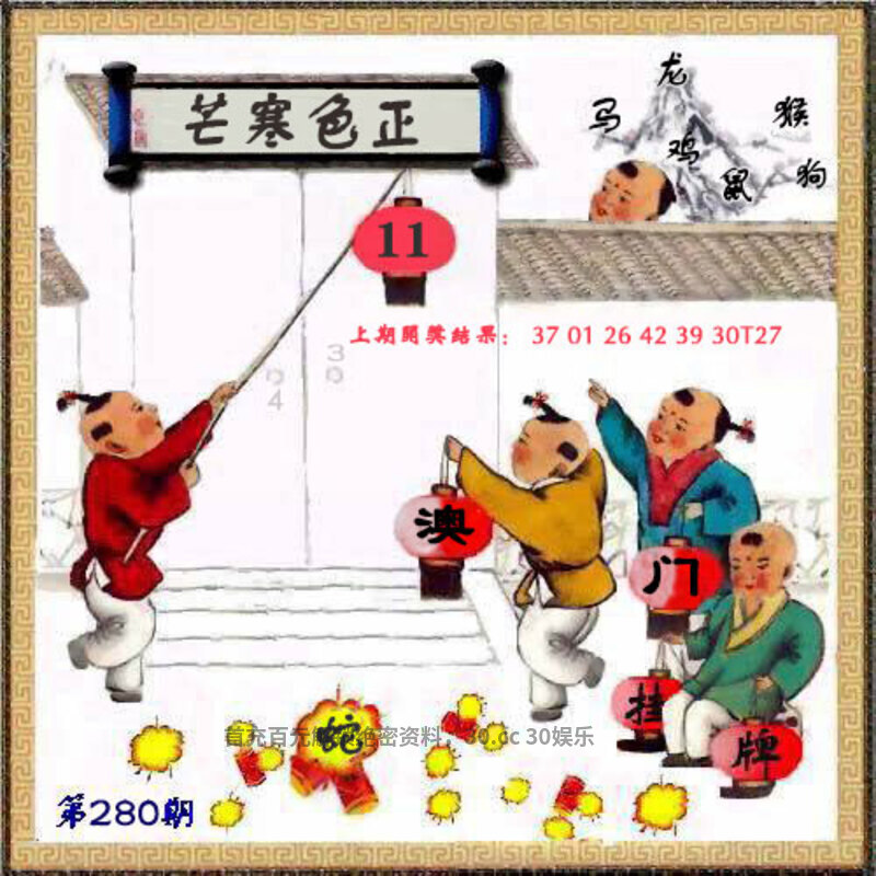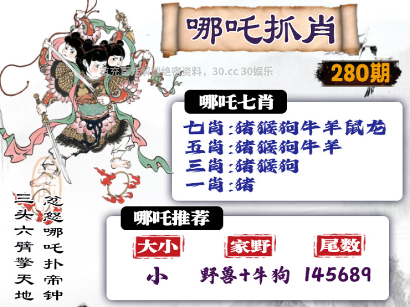 280期: ①七肖中特:猪猴狗牛羊鼠龙 ②大小中特:小数 ③家野+2肖:野兽+牛狗 ④精准六尾:145689 |